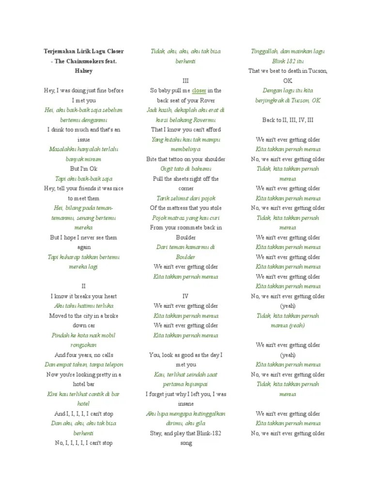 Lirik lagu dan terjemahan the chainsmokers feat. Layanan mobile dari situs entertainment terbesar indonesia, kapanlagi.com. I drink too much and that's an issue. Berikut ini merupakan lirik dari closer sekaligus dengan arti atau terjemahannya. I drink too much and that's an issue